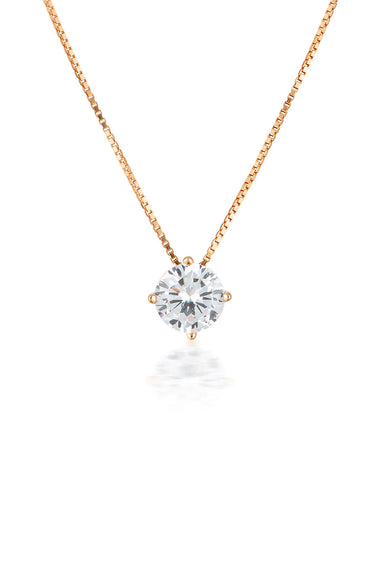 The Georgini Gold Moissanite 1tcw Pendant in 9ct Rose Gold features a 6.5mm round Brilliant cut Moissanite stone. Pair it with the Georgini Gold box chain to make a sparkling piece.