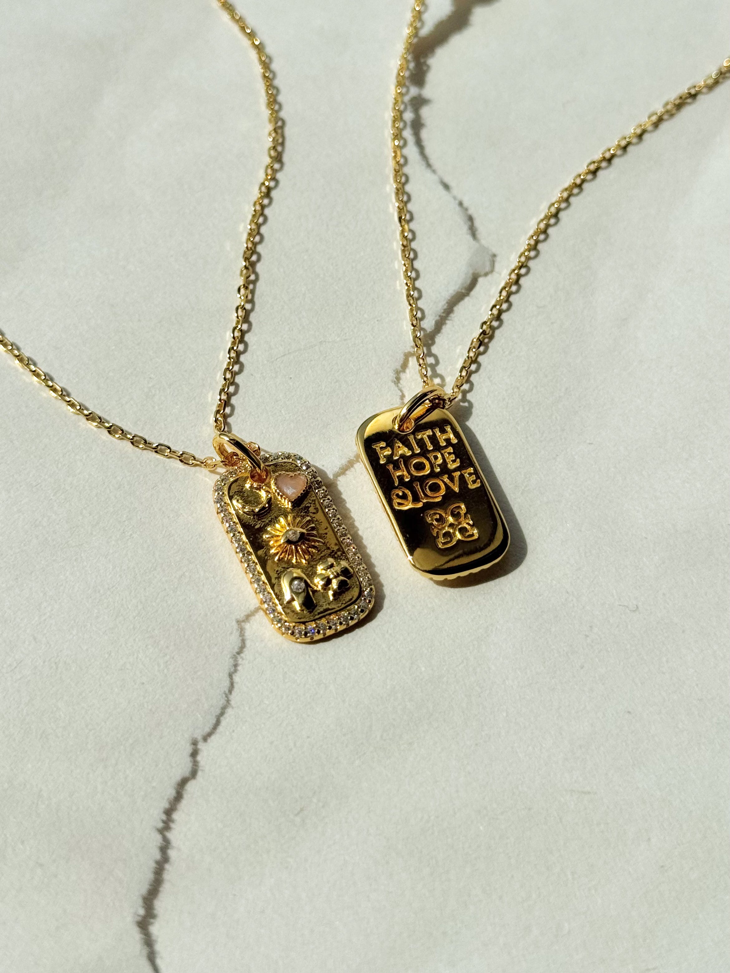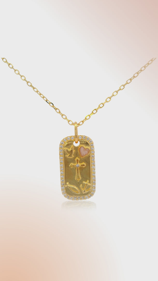 Expertly crafted from 18ct gold e-coated 925 sterling silver, this double-sided pendant features meaningful icons of faith and devotion: a cross, dove, heart, fish, and anchor — each representing strength, peace, love, and steadfast hope.