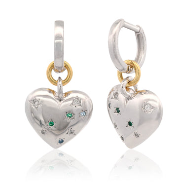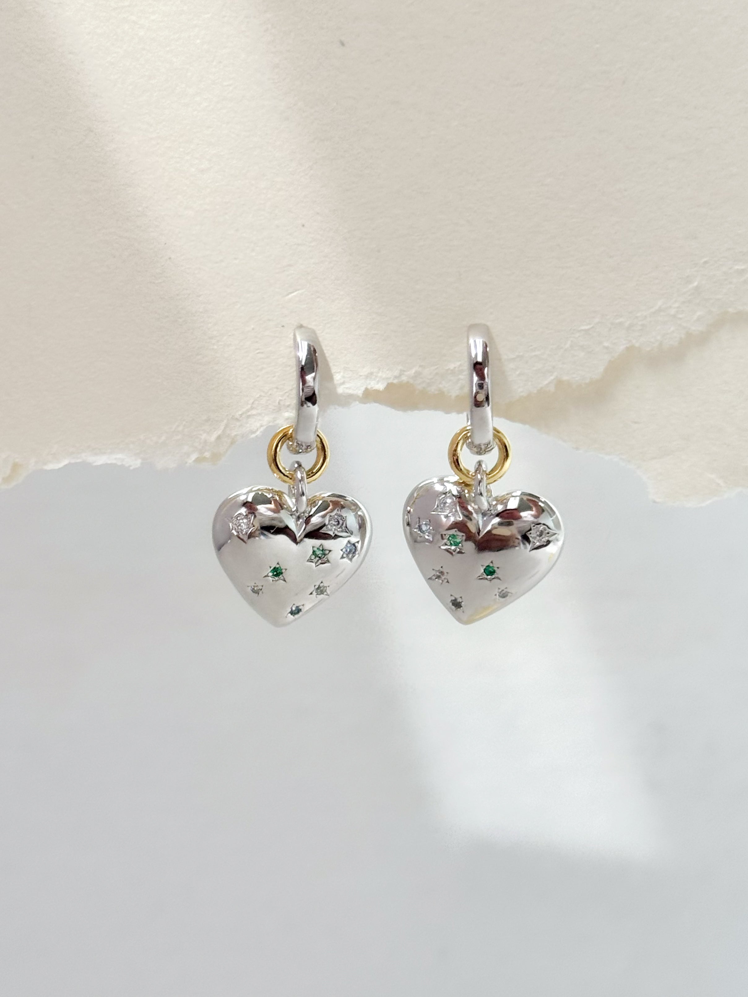 Elevate your style with the Pop Goes My Heart Earrings — a luxurious expression of playful elegance. A radiant silver heart takes centre stage, illuminated with a vibrant mosaic of white, blue, and green cubic zirconias that catch the light with every movement.
